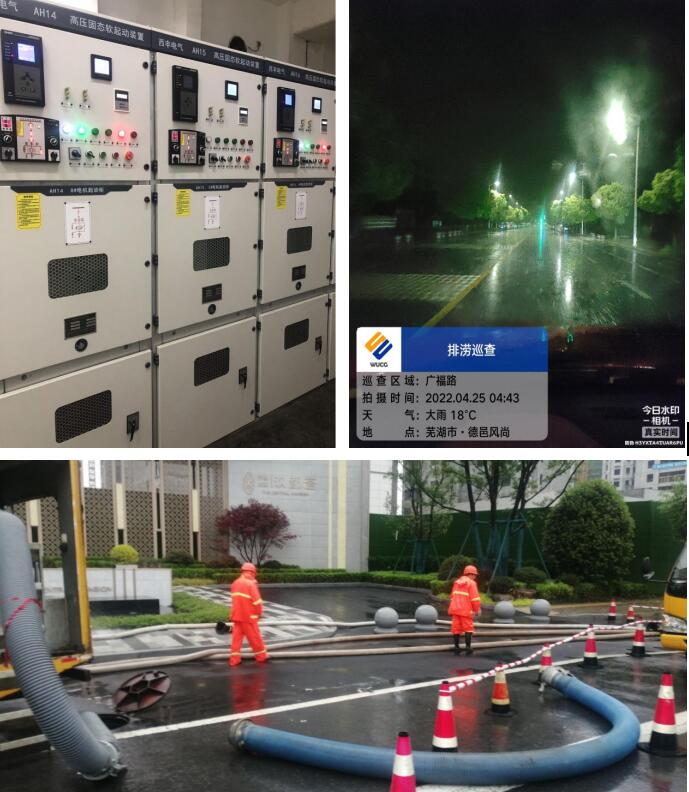 “21點21分,請各路段排澇應(yīng)急責(zé)任人,做好上路巡查準備。”“22點28分,弋江泵站,夜間開機排水。騰空前池水位,為突發(fā)降雨做準備!”“凌晨3點40分,桂花橋泵站開機排水。”“凌晨4點47分,政通公司巡查廣福路,路面無積水,通行正常。”“凌晨5點01分,汀海壹品,公交站牌,已積水,有人員值守,泵車正在助排。”“凌晨5點02分,政通公司巡查銀湖北路,天門山路站路面存在積水,已安排隊伍排水,保證路面正常通行。”“凌晨6點13分,排澇泵車汀海壹品段排水中,路面積水已下降不少,持續(xù)關(guān)注中。”……2022年4月24日晚,蕪湖城區(qū)再次遭遇暴雨夜襲,城建集團工作群里防汛信息頻繁閃爍,而這些信息背后,正是一個個堅守奮戰(zhàn)在雨夜中的城建集團員工。艱難的疫情防控阻擊戰(zhàn)剛剛?cè)〉秒A段性勝利,城建集團的員工們還未來得及體會來之不易的自由,便又開始投入到緊張的防汛工作中。