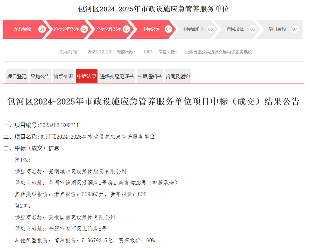 2023年12月29日,我司中標合肥市“包河區(qū)2024-2025年市政泵站設施日常管養(yǎng)”項目與“包河區(qū)2024-2025年市政設施應急管養(yǎng)服務單位”項目,這兩個項目的成功中標,既是我司阿米巴2024年開篇之作,亦是我們兩年間耕耘包河區(qū)市政養(yǎng)護市場的收獲。換句話說,這既是新起點,也是新征程。