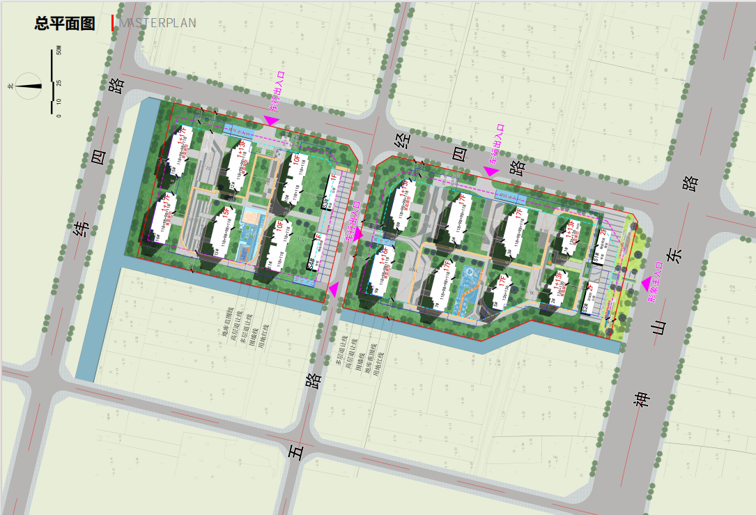 扁擔河3#地塊EPC總承包項目-大信府項目地塊分為兩塊:地塊一占地18419.65平方米,東至經(jīng)四路,南至緯五路,西至縱一水系,北至一橫港水系;地塊二占地23582.9平方米,東至經(jīng)四路、南至神山東路、西至縱一水系、北至緯五路。地塊總占地面積42002.55平方米,容積率2.0,總計容面積83930.01平方米,其中住宅面積約82440平方米,配套面積約1490平方米;地庫面積約26965平方米。