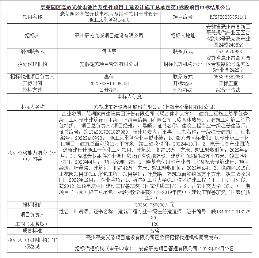 近日,蕪湖城市建設(shè)集團(tuán)股份有限公司緊跟國(guó)家可再生能源發(fā)展方向,以良好的信譽(yù)、雄厚的技術(shù)實(shí)力,加之優(yōu)秀的投標(biāo)方案和合理報(bào)價(jià),中標(biāo)亳蕪園區(qū)高效光伏電池片及組件項(xiàng)目土建設(shè)計(jì)施工總承包工程,中標(biāo)金額約為3億元!