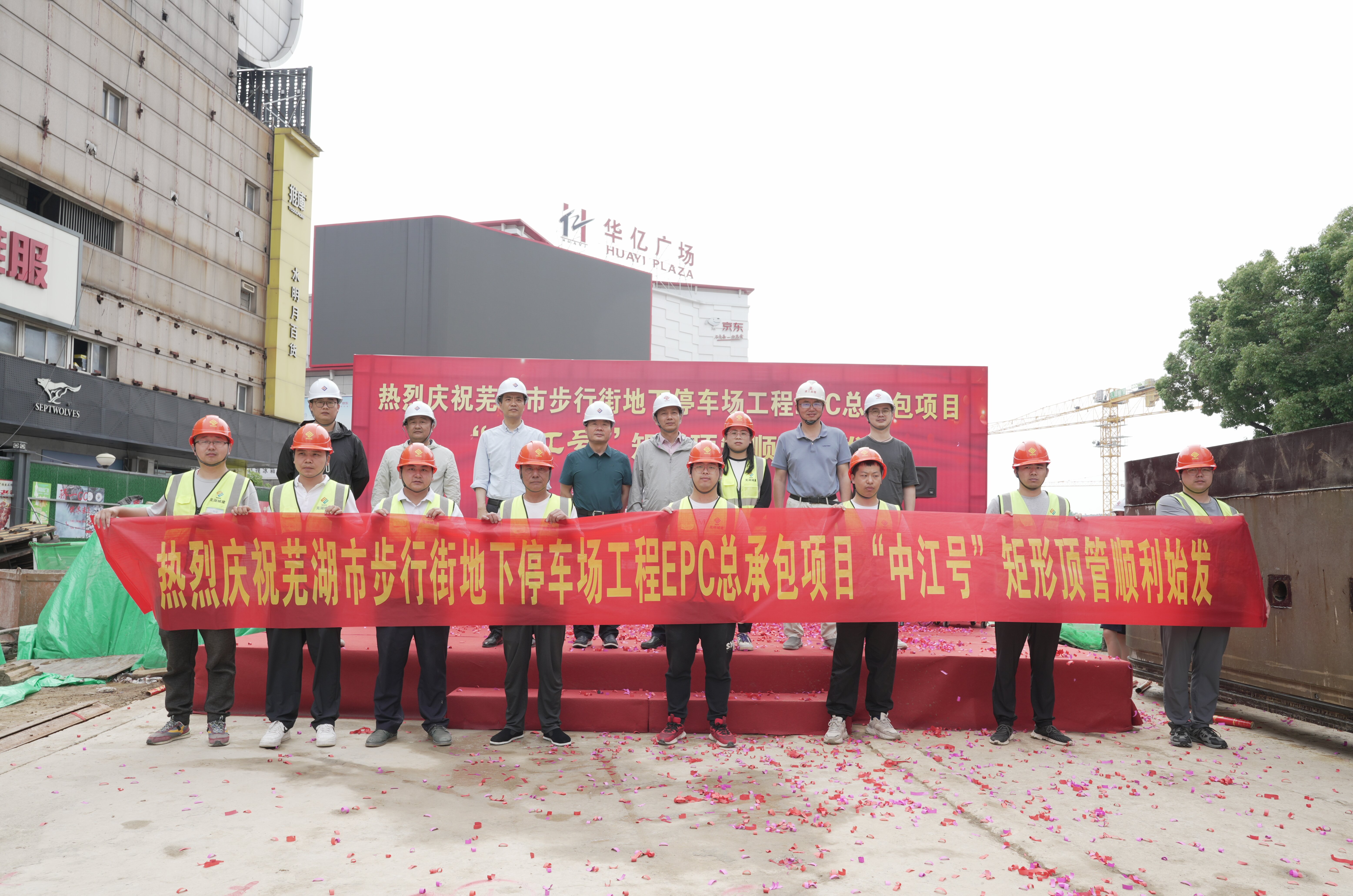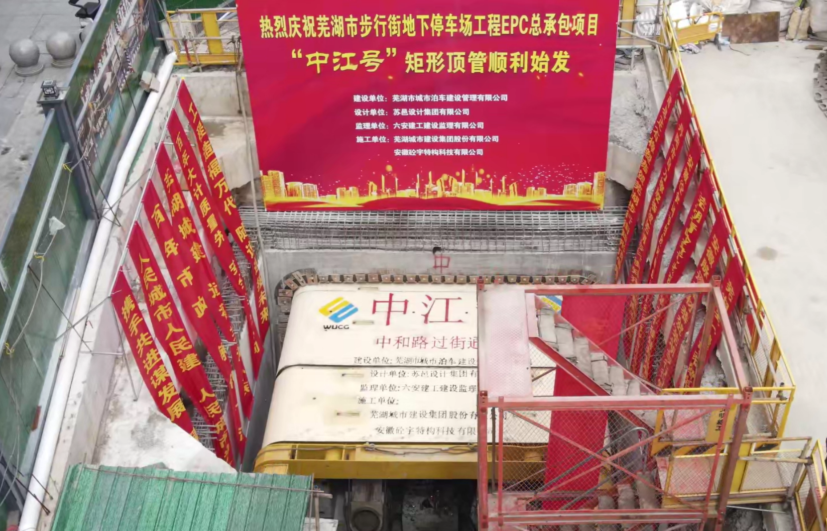 2024年5月22日,蕪湖市中和路步行街地下停車場(chǎng)工程舉行矩形頂管頂進(jìn)始發(fā)儀式,安徽中江城建集團(tuán)有限公司董事長(zhǎng)朱志福、蕪湖市交通投資有限公司董事長(zhǎng)戴松柏出席儀式。
