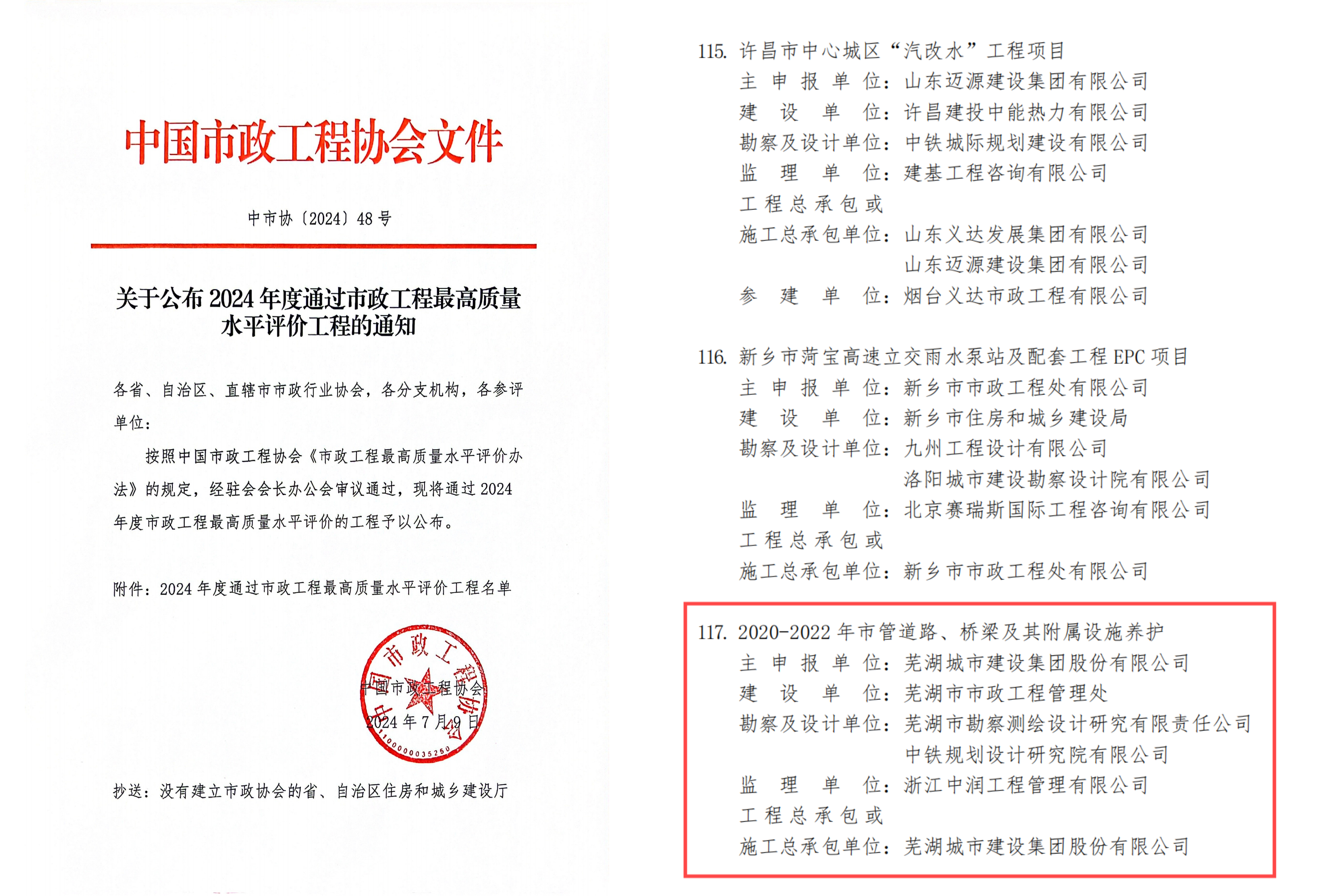 7月9日,中國(guó)市政工程協(xié)會(huì)發(fā)布了“2024年市政工程最高質(zhì)量水平評(píng)價(jià)”獲獎(jiǎng)名單。由蕪湖城市建設(shè)集團(tuán)股份有限公司承攬的“2020—2022年市管道路、橋梁及其附屬設(shè)施養(yǎng)護(hù)”項(xiàng)目憑借著扎實(shí)的養(yǎng)護(hù)功底、過(guò)硬的技術(shù)水平及強(qiáng)勁的綜合實(shí)力從眾多項(xiàng)目中脫穎而出,榮登榜單。