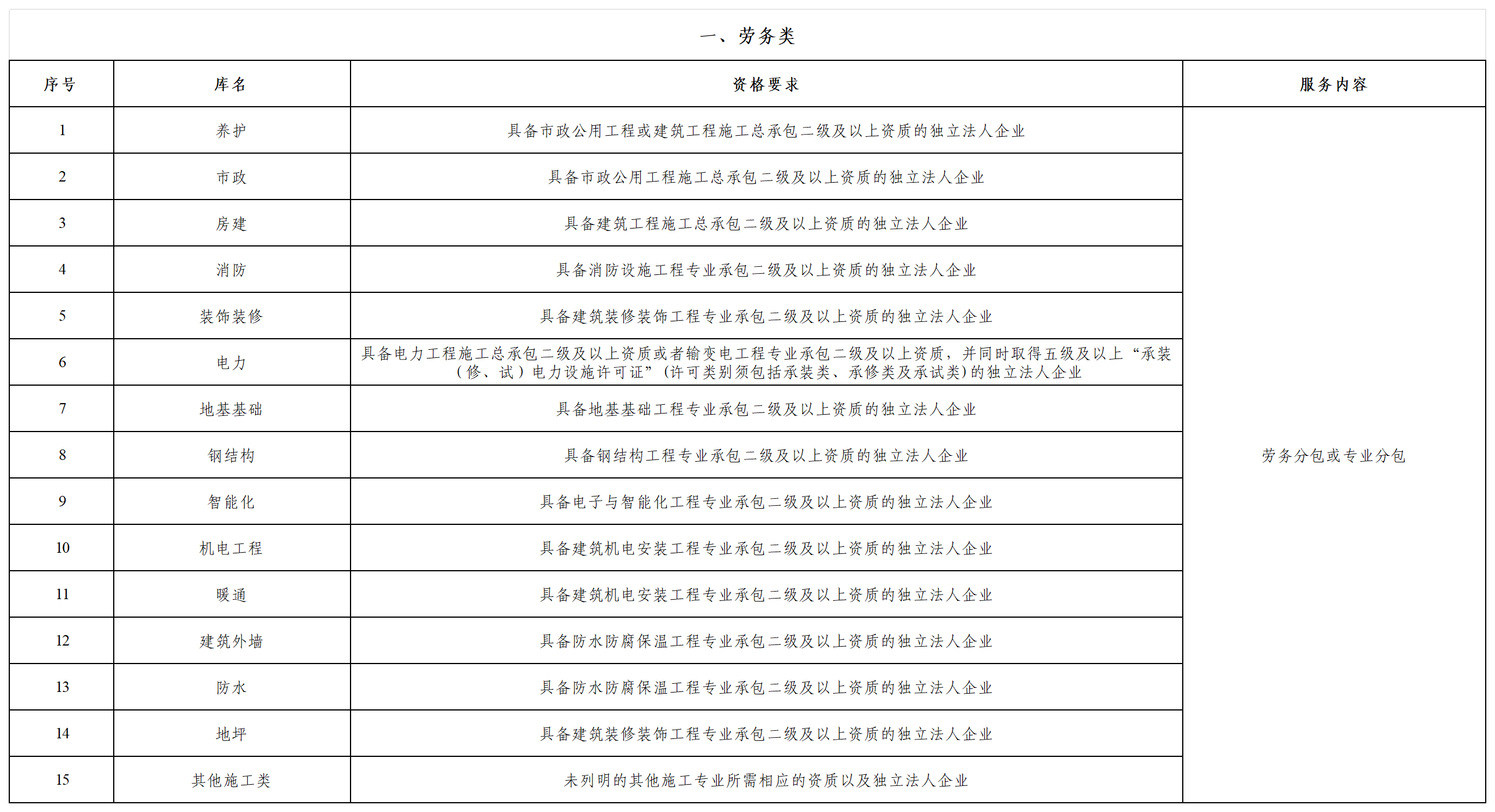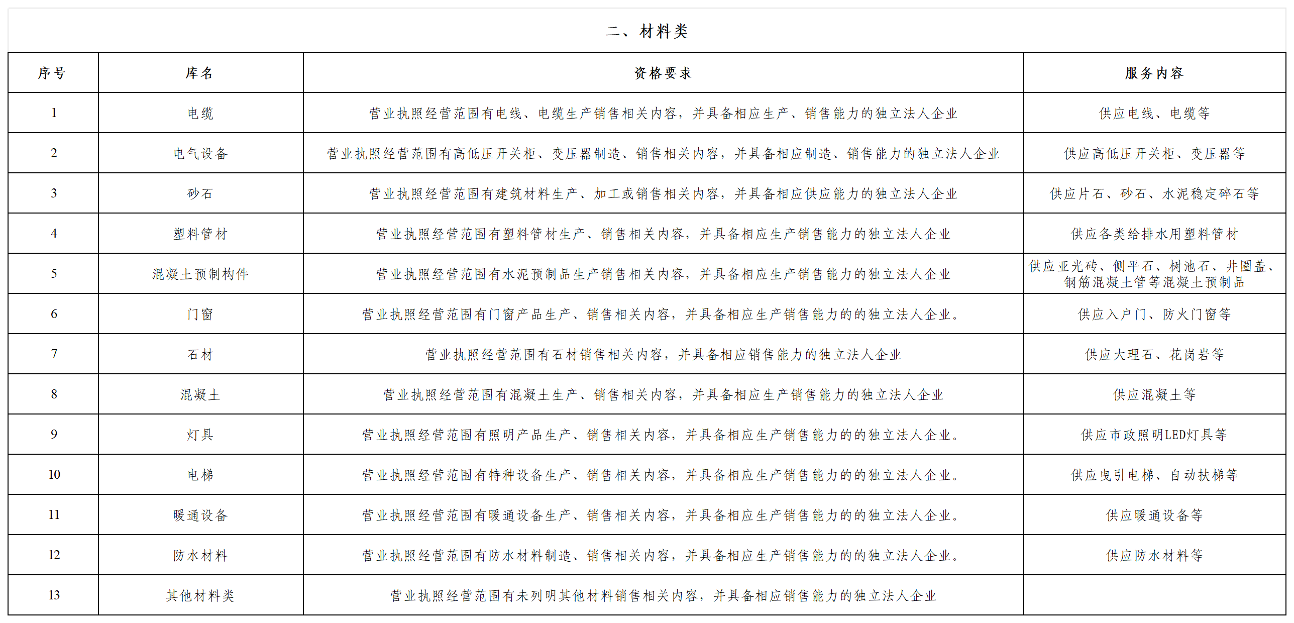 本次征集供應(yīng)商庫分為勞務(wù)和材料兩類,勞務(wù)類包含15個庫,材料類包含13個庫,應(yīng)征人可選擇其中一個或多個參與。